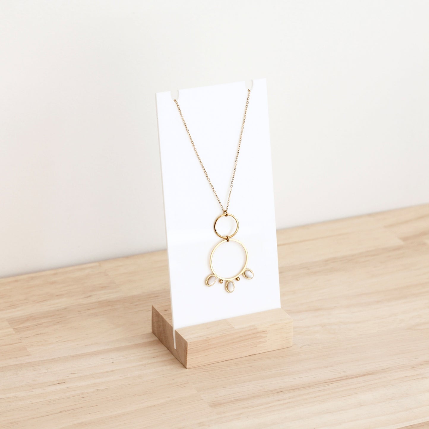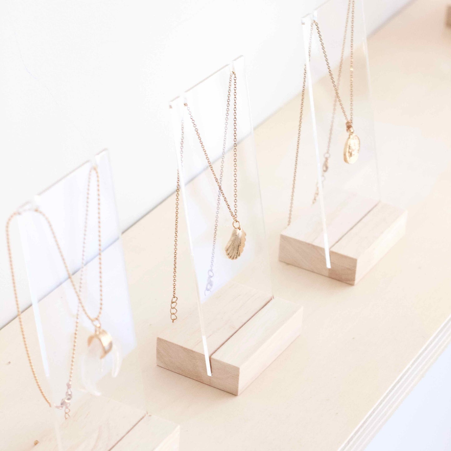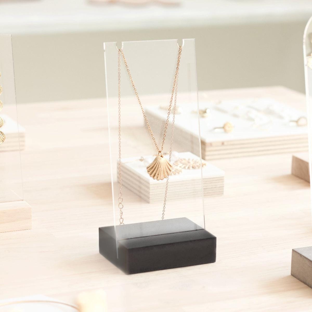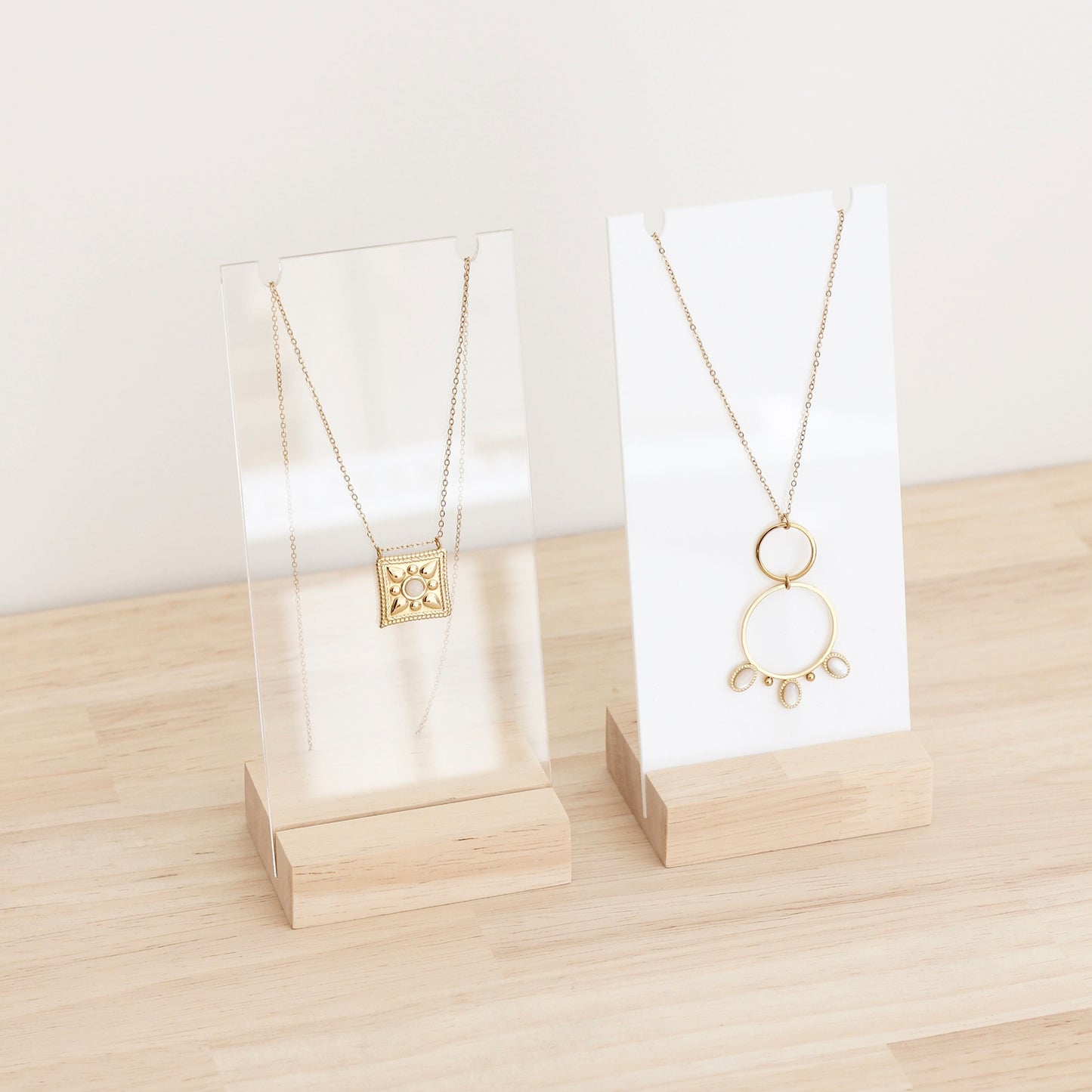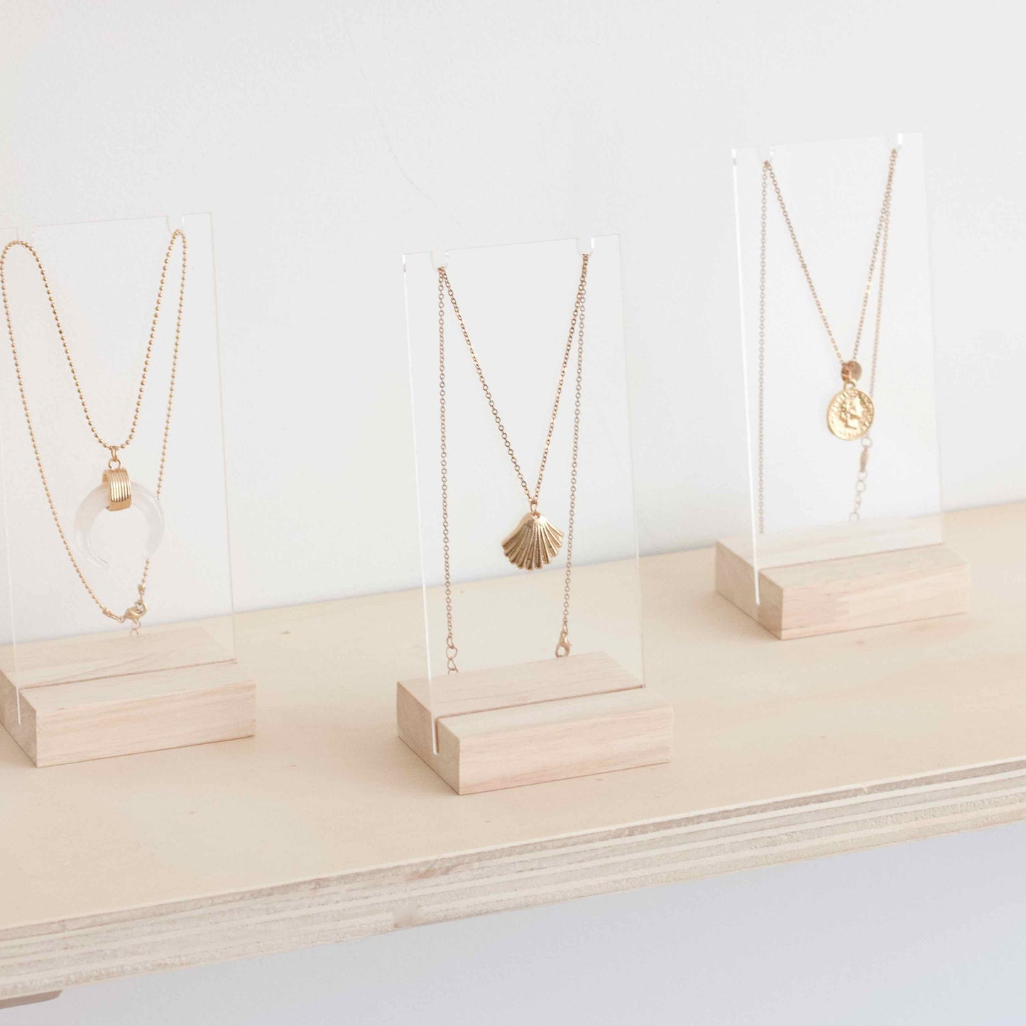 Our EMMA jewelry display showcases your pendants and necklaces with elegance and professionalism. Designed with a wooden base and acrylic stand, it combines minimalism with modern design.