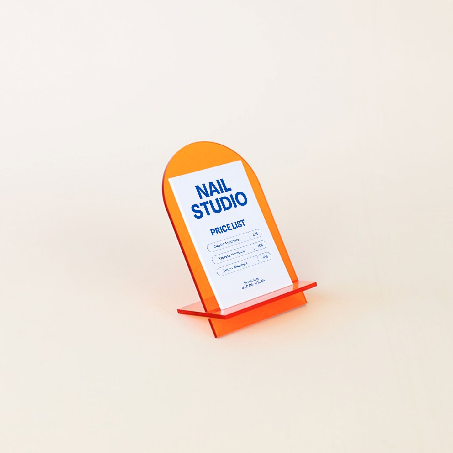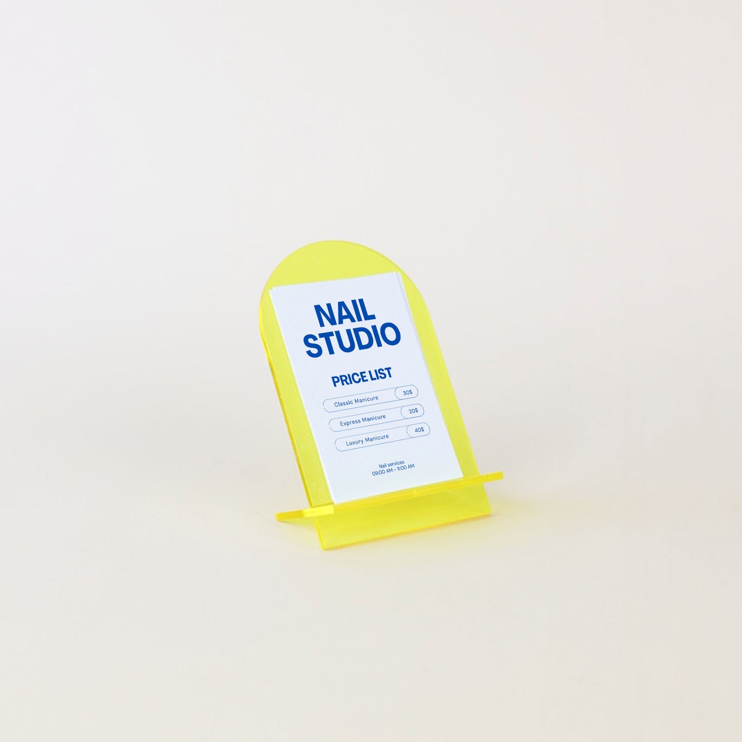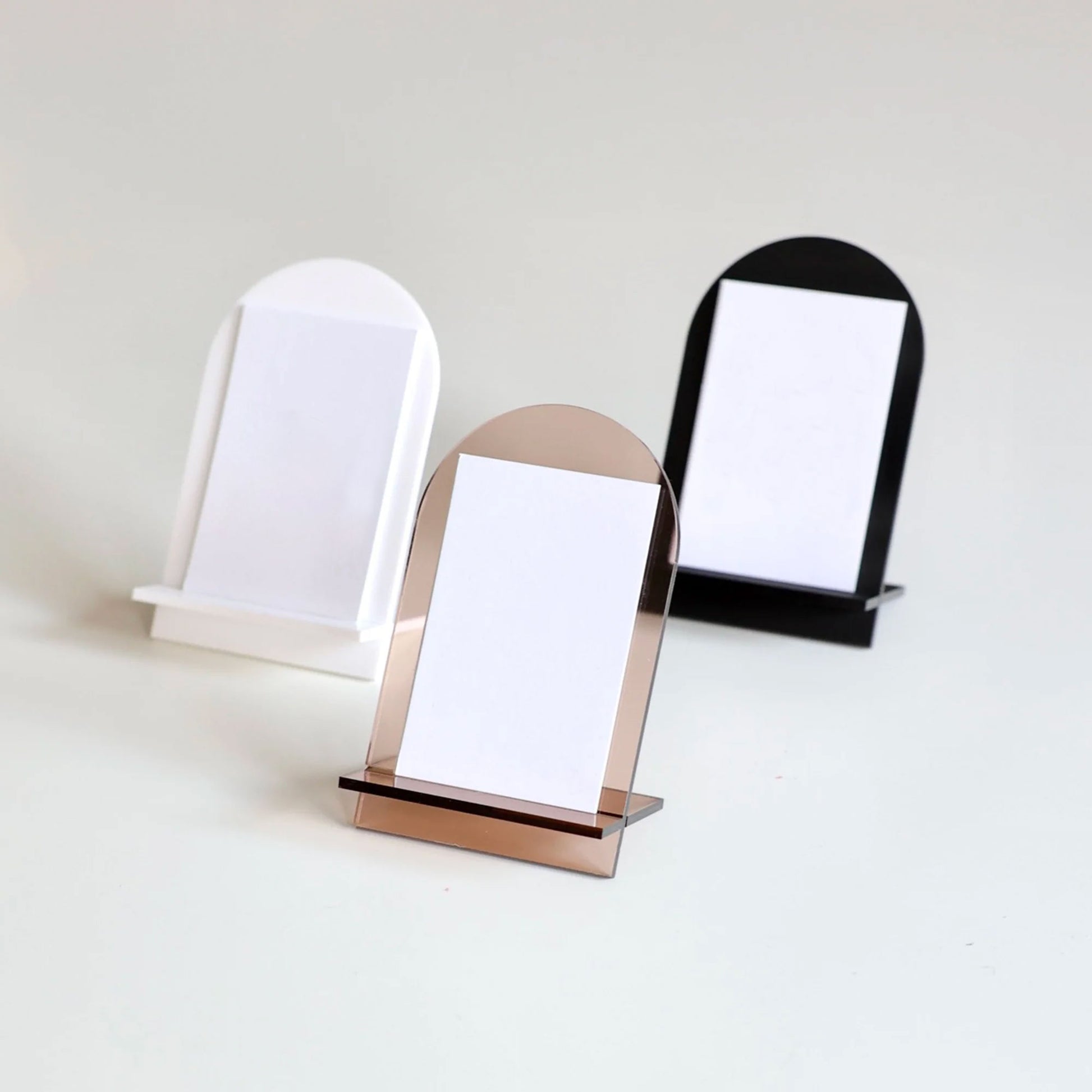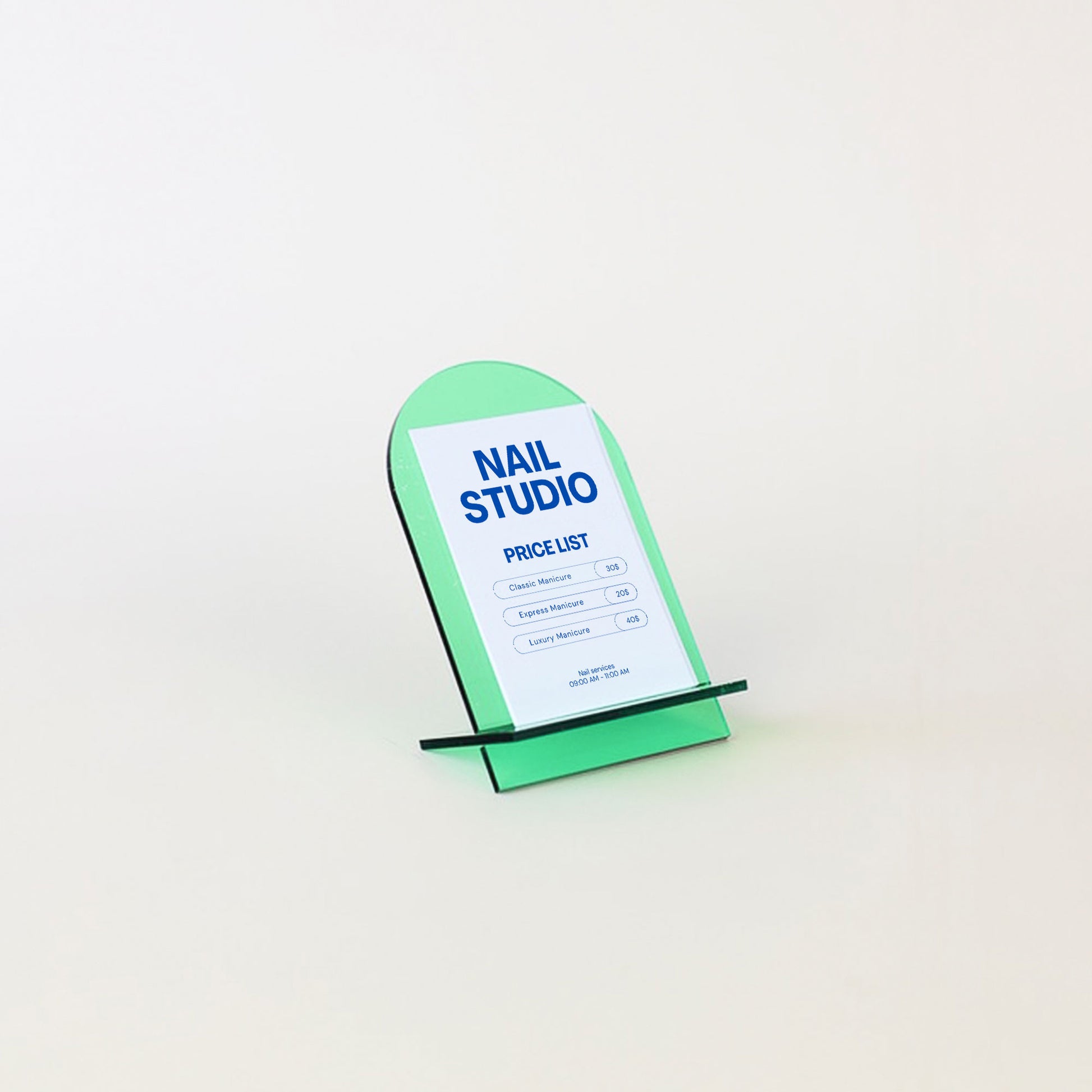 Showcase your brand or services in style with the JUDE display stand. Its sleek, minimalist design is specially designed to hold your portrait-sized business cards. With its contemporary arched shape, it blends seamlessly into any space, from offices and boutiques to professional stands.