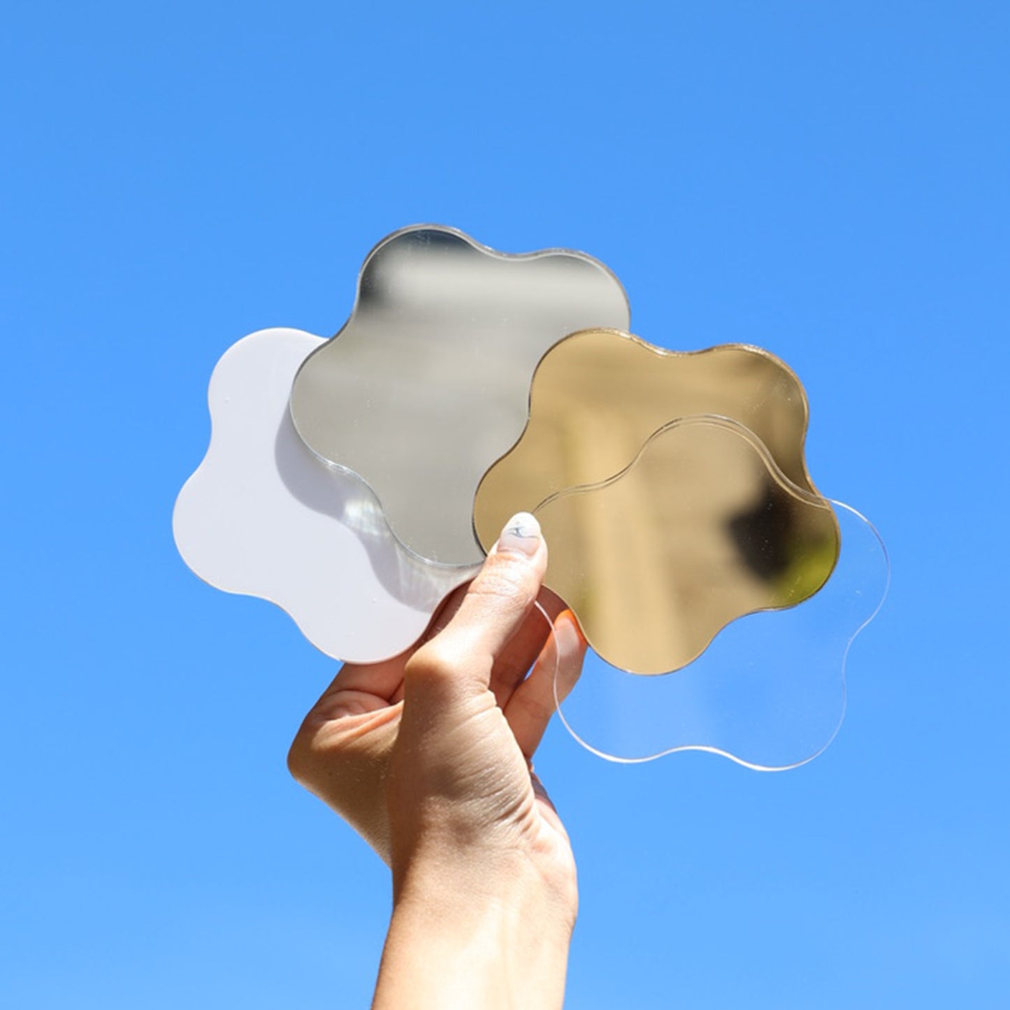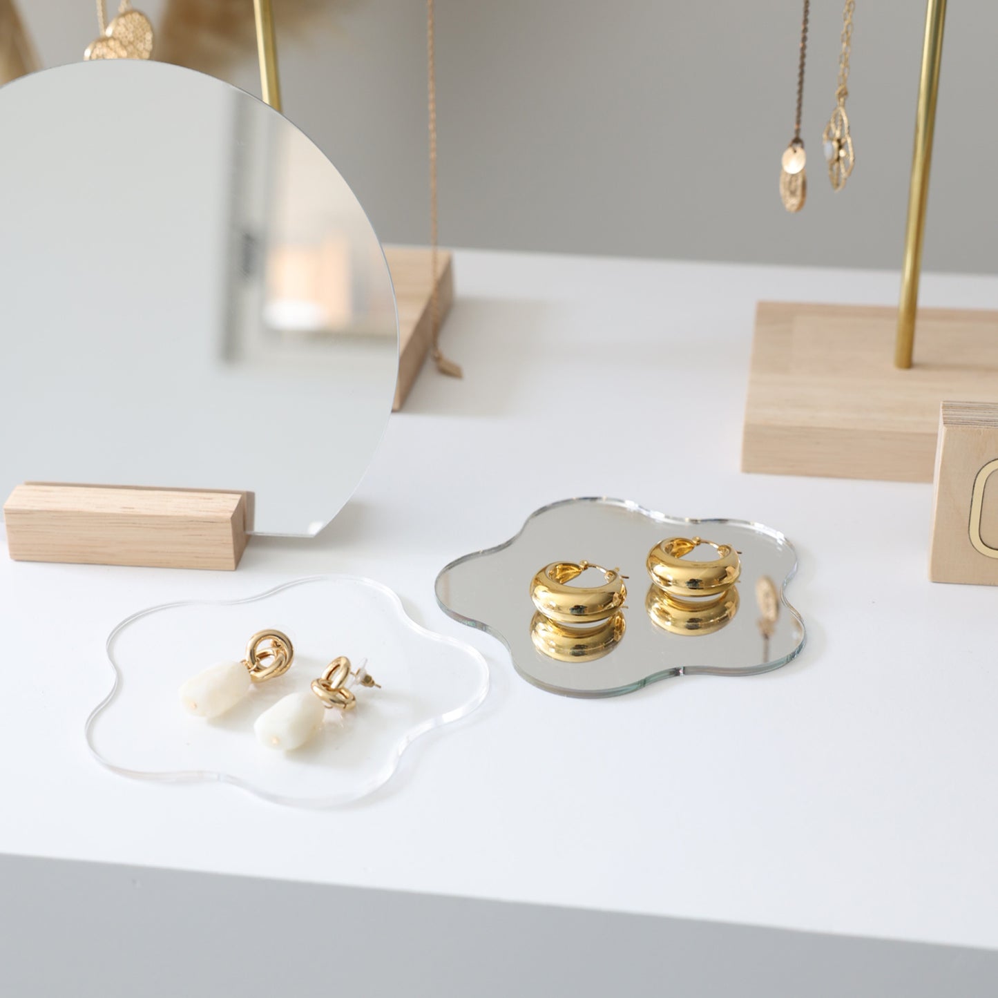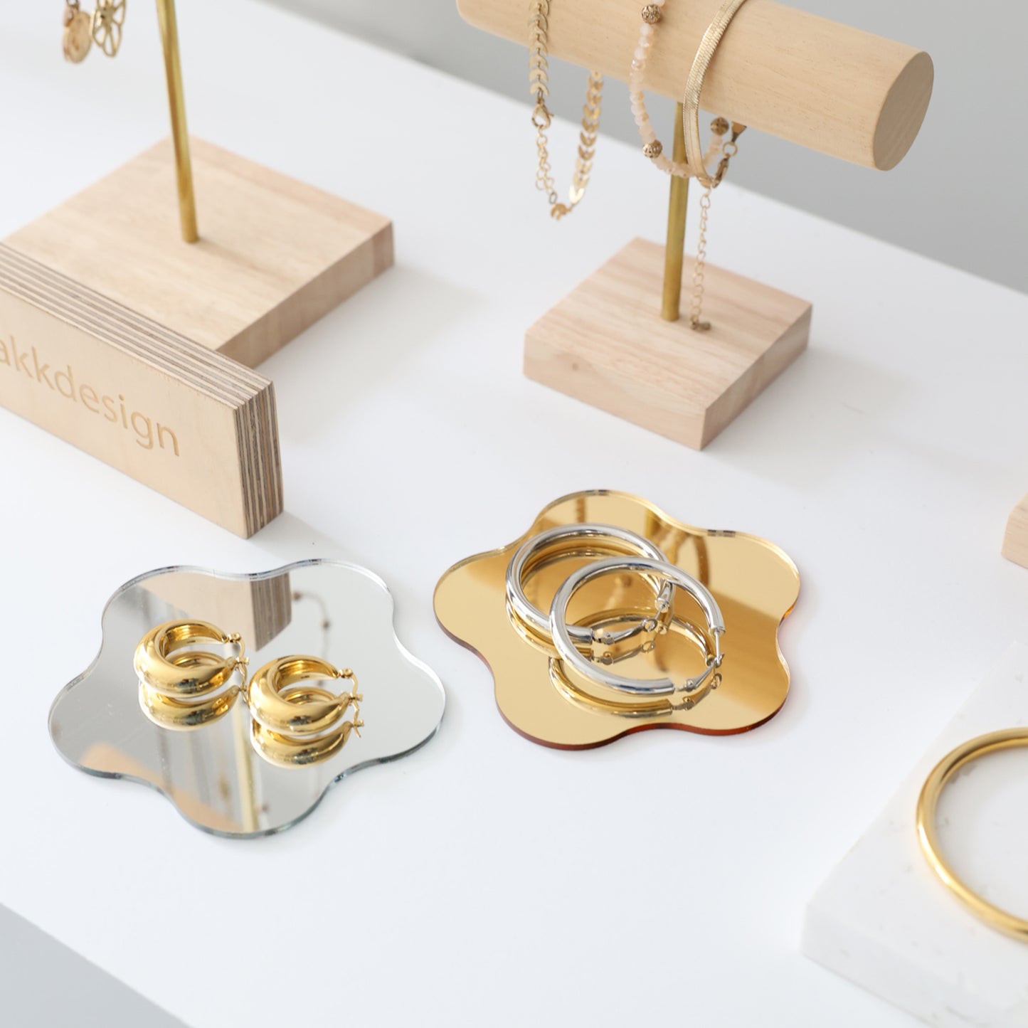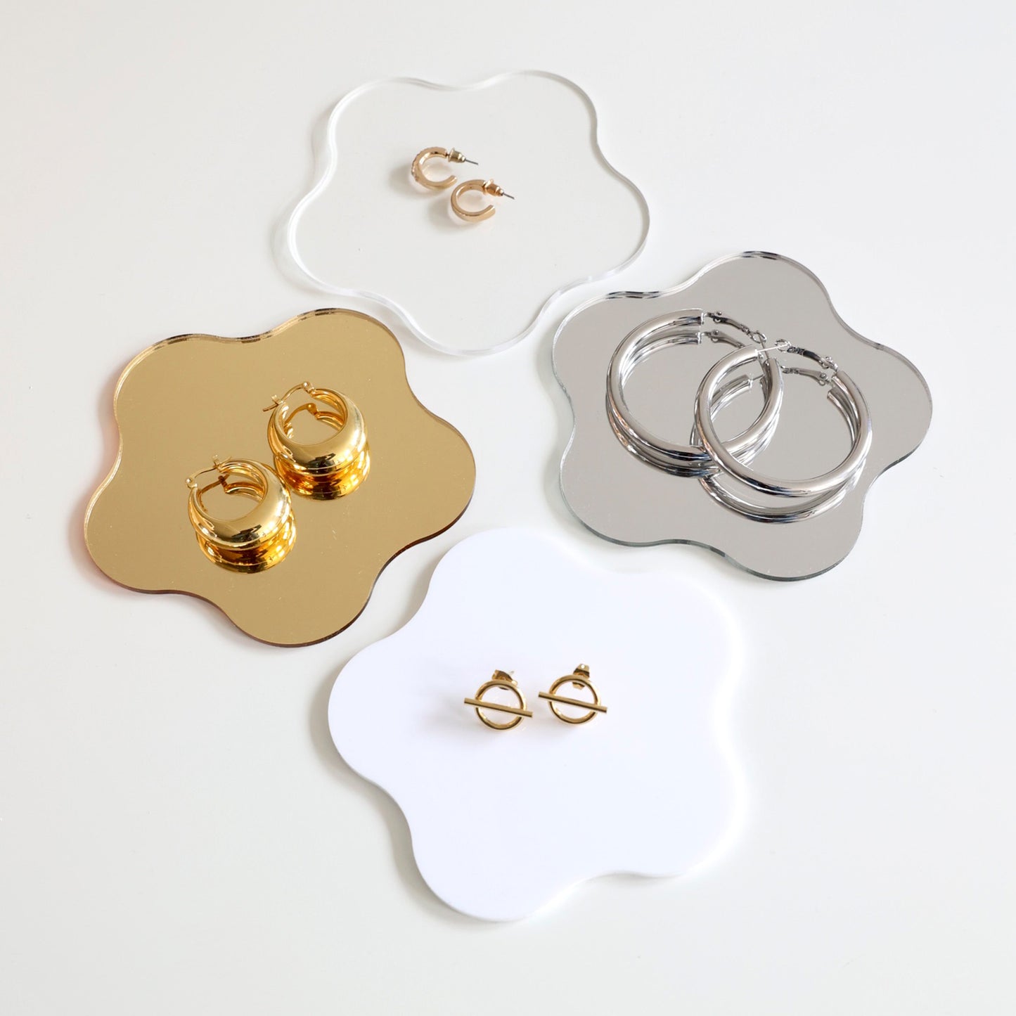 Nos miroirs en forme de fleur attirent l'oeil et apportent de la lumière à votre présentation de bijoux. A disposer seul ou avec des bijoux dessus, ces supports ajouteront une touche unique à votre merchandising.