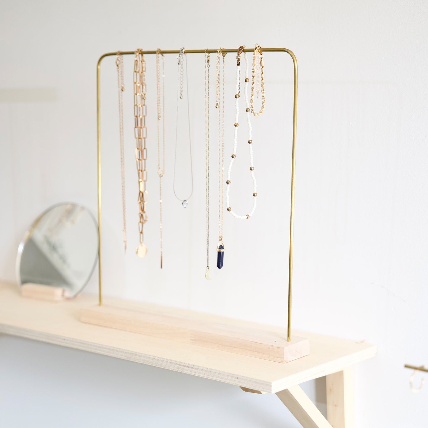 Notre support pour bijoux LYKKE est fabriqué à partir d'une structure simple en bois et laiton doré. Ce portant à bijoux mettra en valeur vos colliers, bracelets ou boucles d'oreilles. Choisissez la hauteur ainsi que l'essence de bois qui convient à votre style.